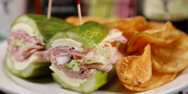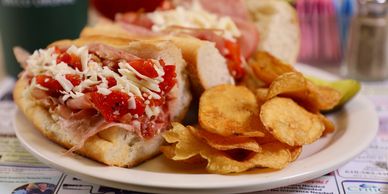 Try our pickle hoagie with your choice of Italian, Ham or Turkey with American cheese, lettuce, tomato, onion & oregano on a dill pickle served with seasoned chips!