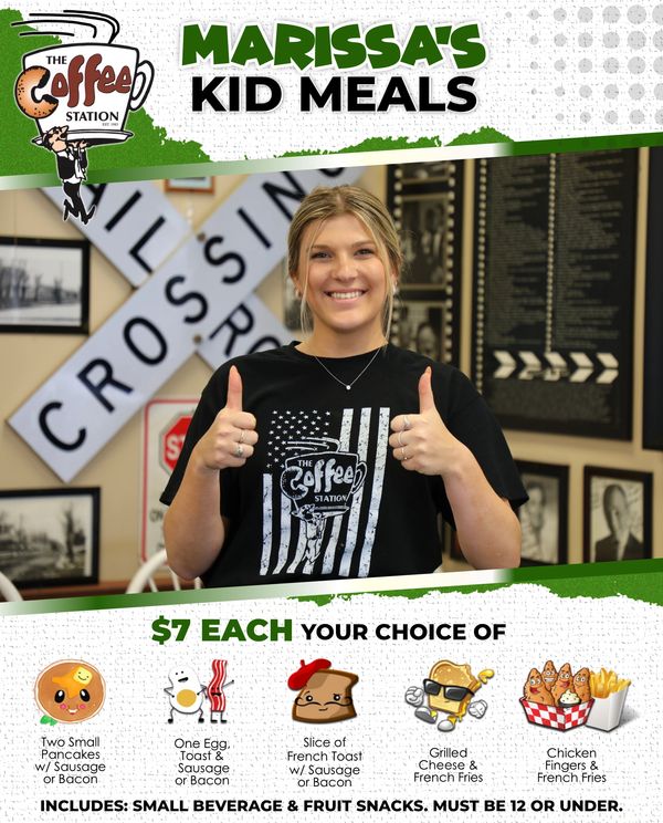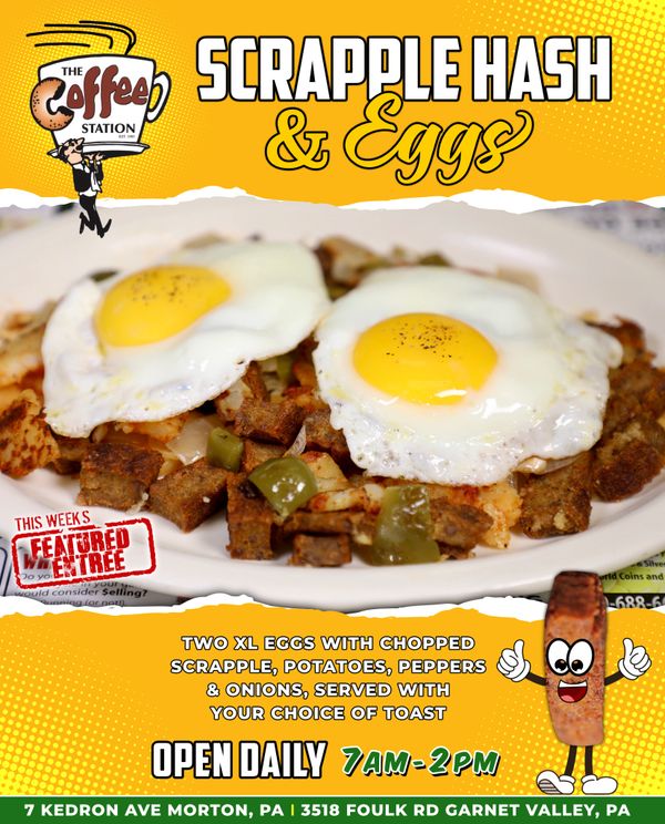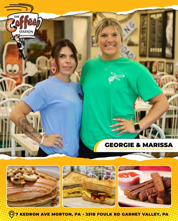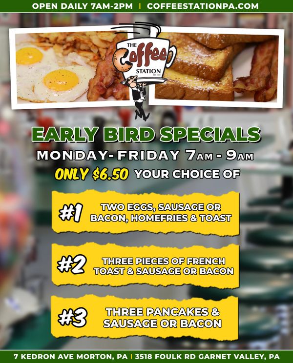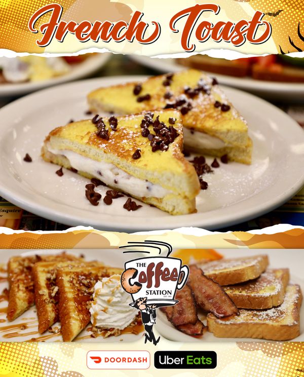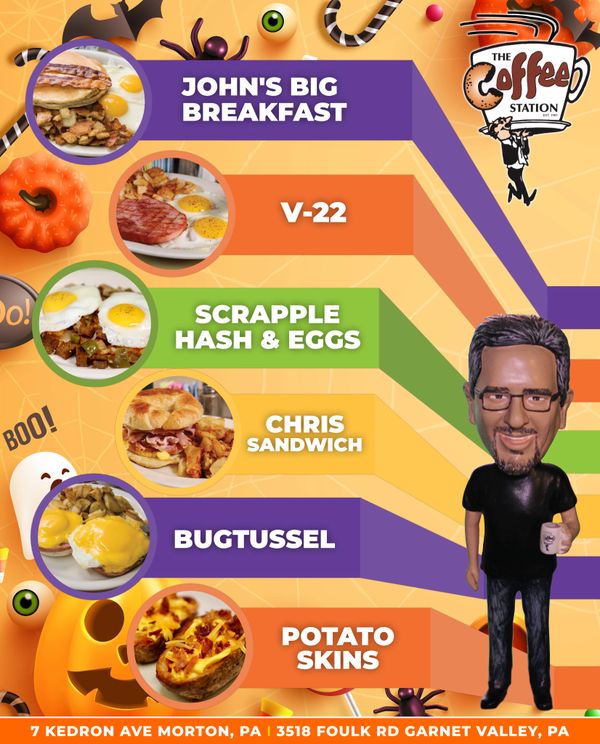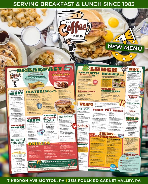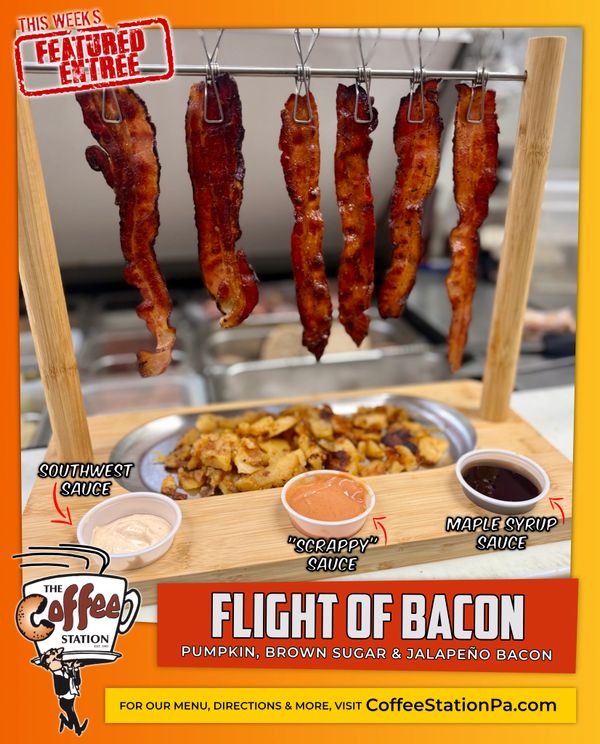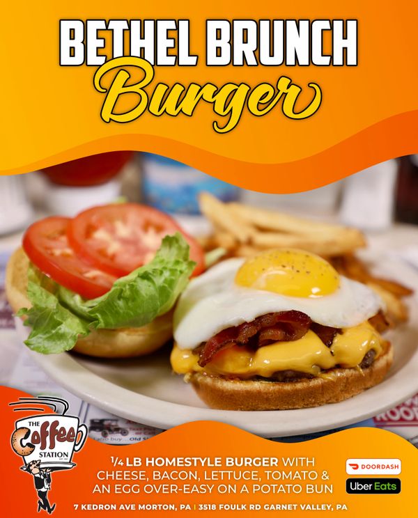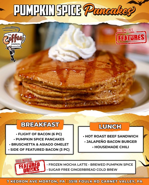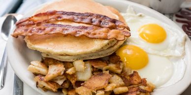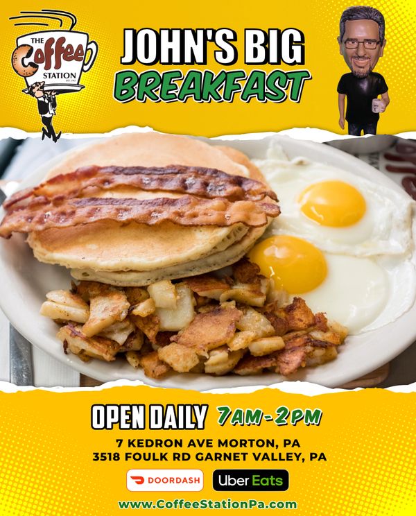 "John's Big Breakfast" is a Coffee Station classic! 2 Pancakes, 2 Eggs, 2 Slices of Bacon & Home fries!