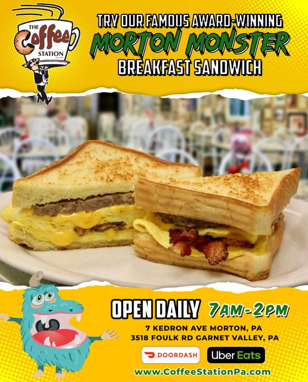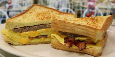 Try our Famous award winning Morton monster breakfast sandwich. Two scrambled eggs, bacon, sausage & cheese on Texas toast!